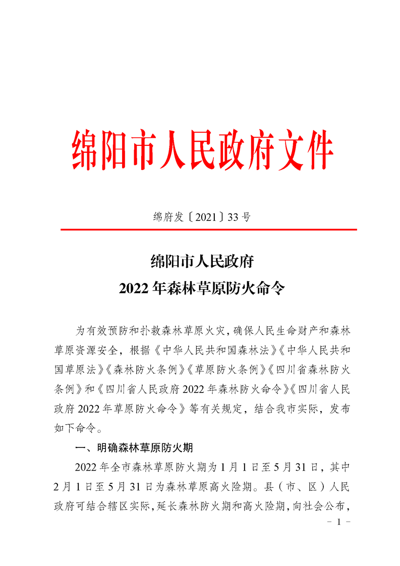 綿陽市人民政府2022年森林草原防火命令
